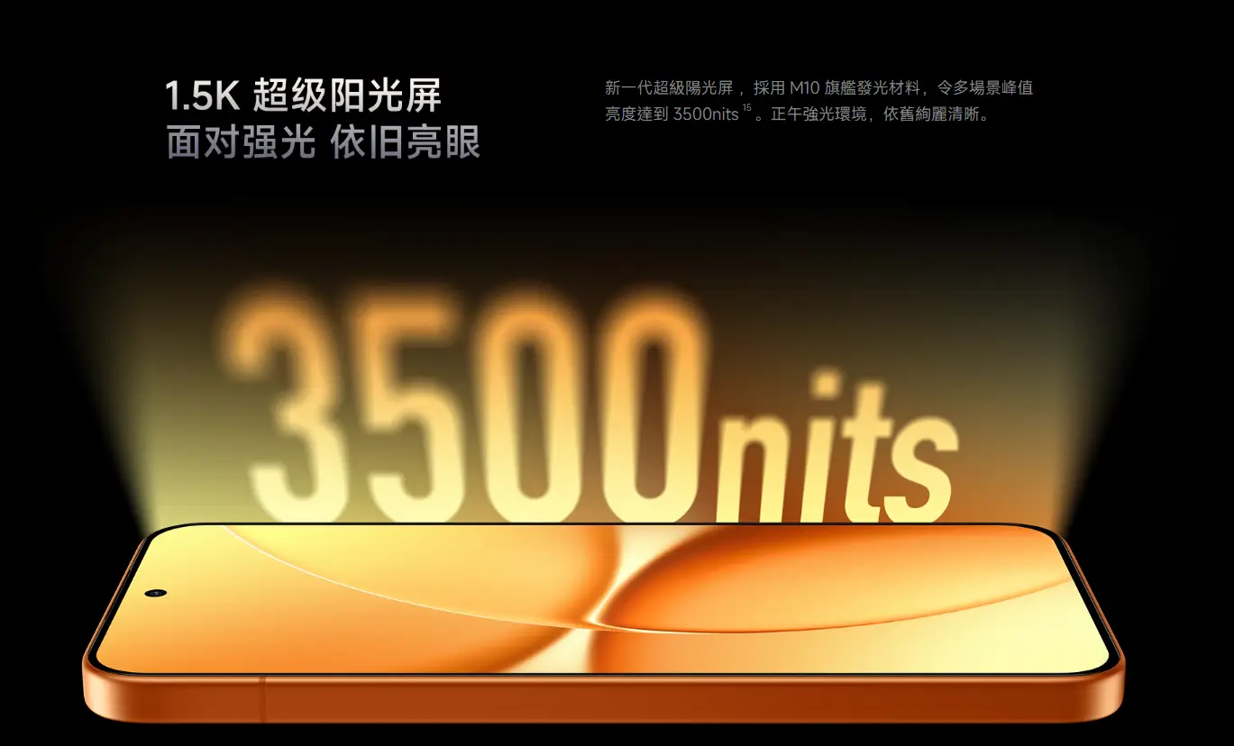 6.83 吋 AMOLED 超窄邊直屏,同樣採用 M10 發光材料,峰值亮度最高達 3500 nits,