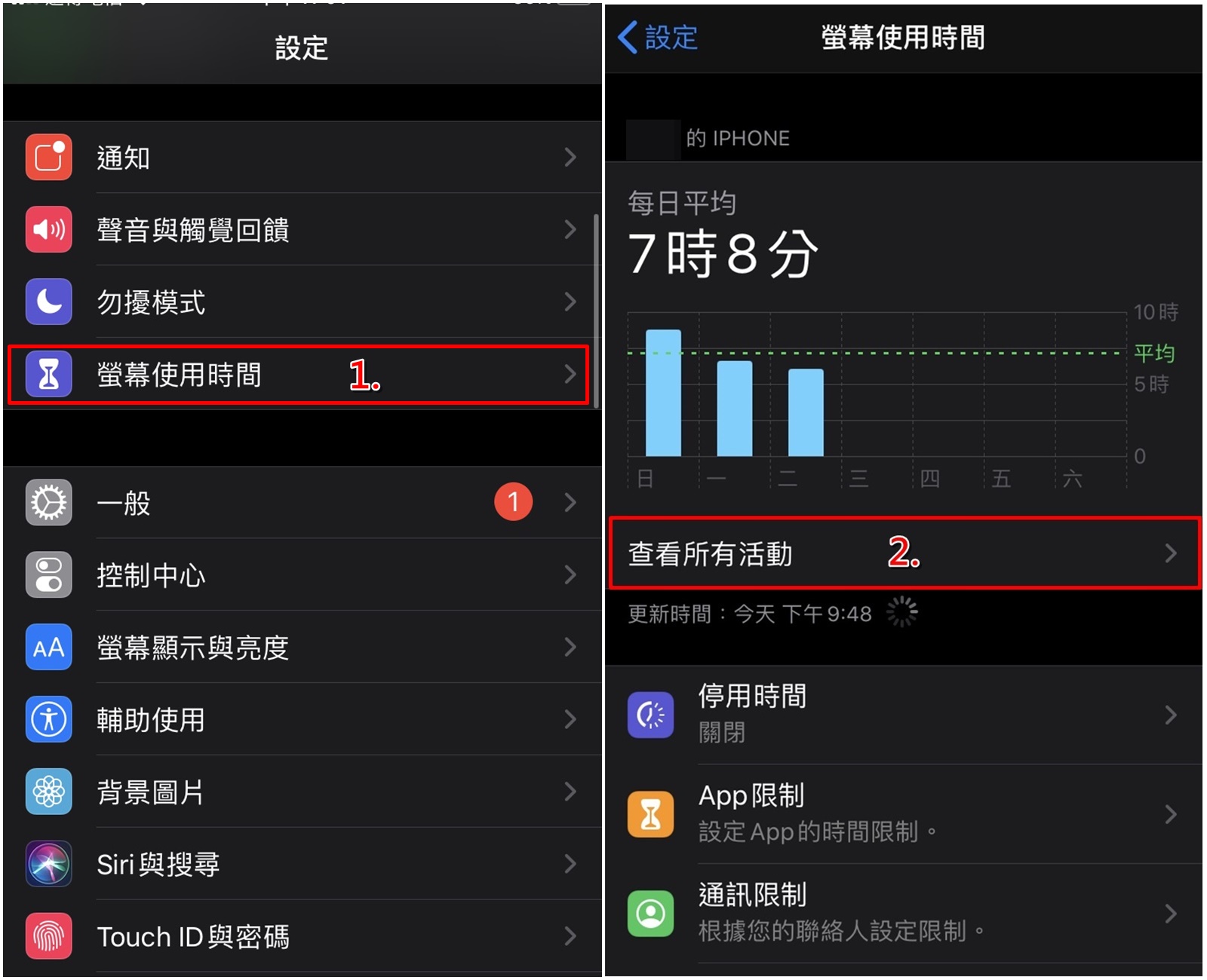 首先,我們要打開手機的「設定」,選擇「螢幕使用時間」>「查看所有活動」。