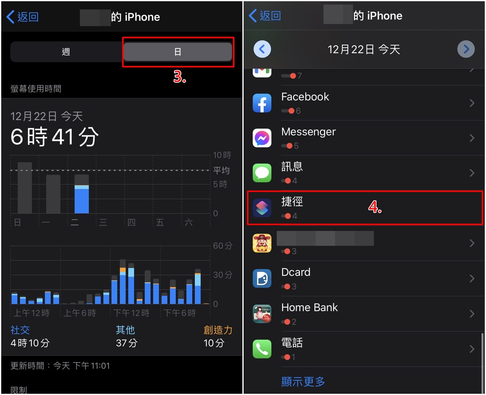 在「通知」區塊中找到「捷徑」之後,請直接點選它;假如你發現在這裡找不到「捷徑」的選項,就代表手機今日尚未收到相關的通知,你可以選擇過去的其他日期,直到在此找到「捷徑」為止。