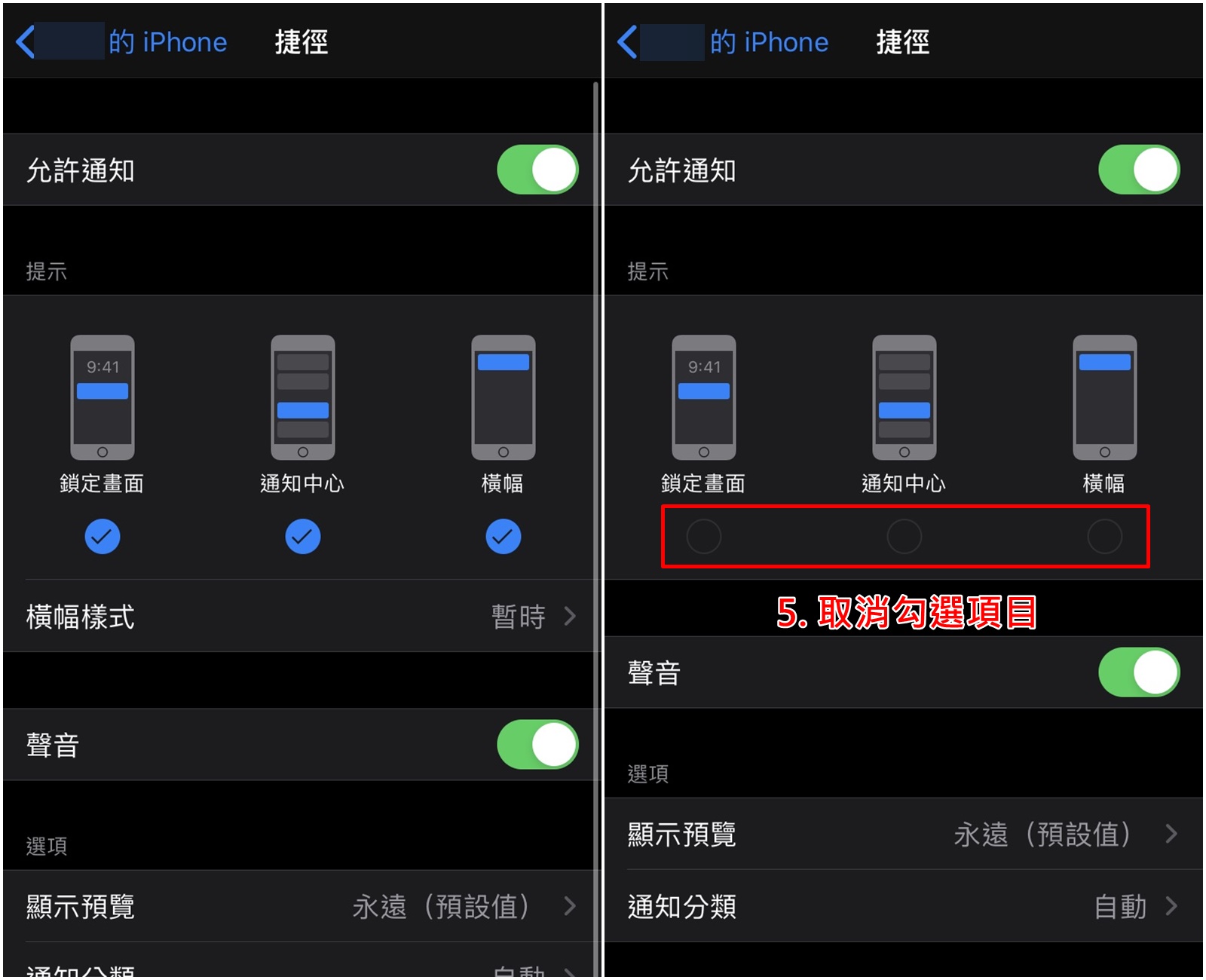 最後,我們只要將提示區域的「鎖定畫面」、「通知中心」以及「橫幅」,三個選項都取消勾選,未來手機在執行行自動化捷徑時,就不再會出現相關的推播提醒囉!